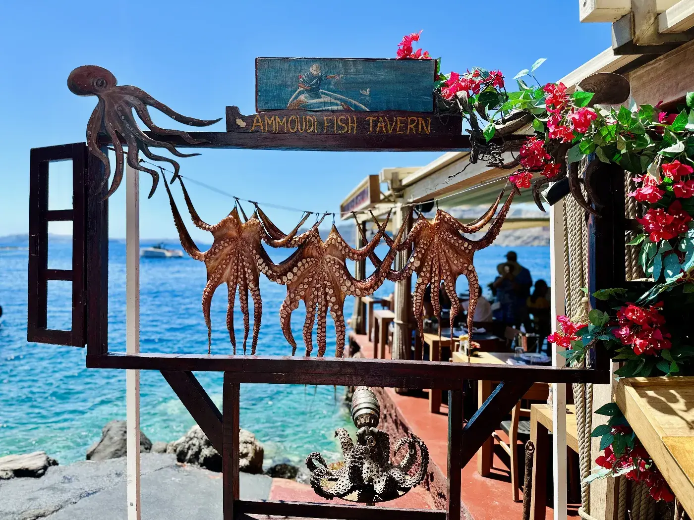 Ammoudi Fish Tavern dispone de una carta moderna pero también tradicional, destilando en toda ella aire mediterráneo y dando valor a los productos griegos, y muy especial atención a los locales (pecados, mariscos y vinos).