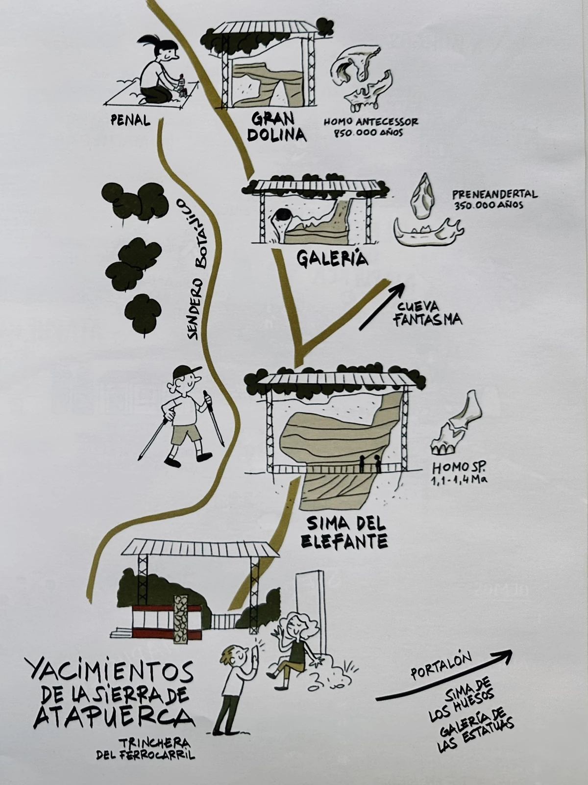 Sima del Elefante nos cuenta «cuándo llegamos», Sima Galería explica «cómo vivimos y cazamos», la Sima Gran Dolina revela «quiénes éramos» y la Sima de los Huesos revela «en quiénes nos estábamos convirtiendo». Juntas forman la columna vertebral de Atapuerca: cuatro capítulos que, leídos en orden, narran más de un millón de años de evolución humana en el mismo cerro.