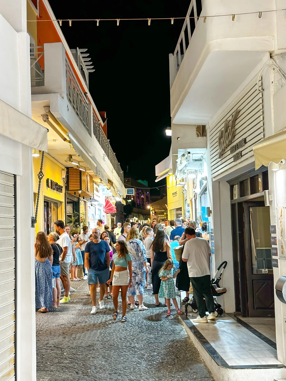Al sur de Imerovigli encontramos la capital de Santorini. Se caracteriza por ser muy concurrida y tener más vida nocturna que los pueblos anteriores. También destaca por sus puntos de interés turístico (museos, catedrales…), su cercanía al aeropuerto y sus vistas a la caldera. La noche en Fira no tiene fin. Tiendecitas abiertas a un horario bastante amplio, muchos bares y restaurantes, y mucha gente disfrutando por sus empedradas y empinadas calles.