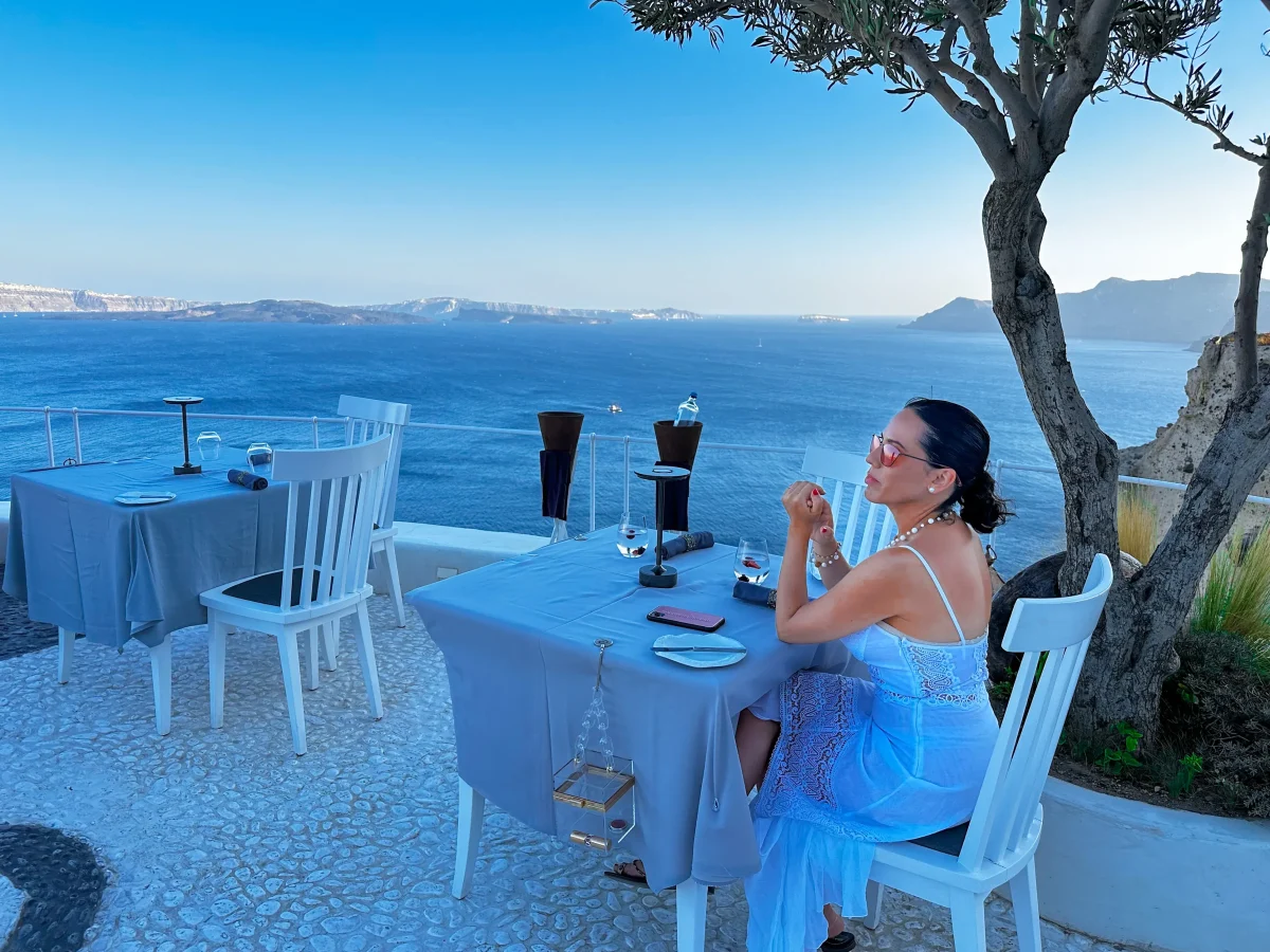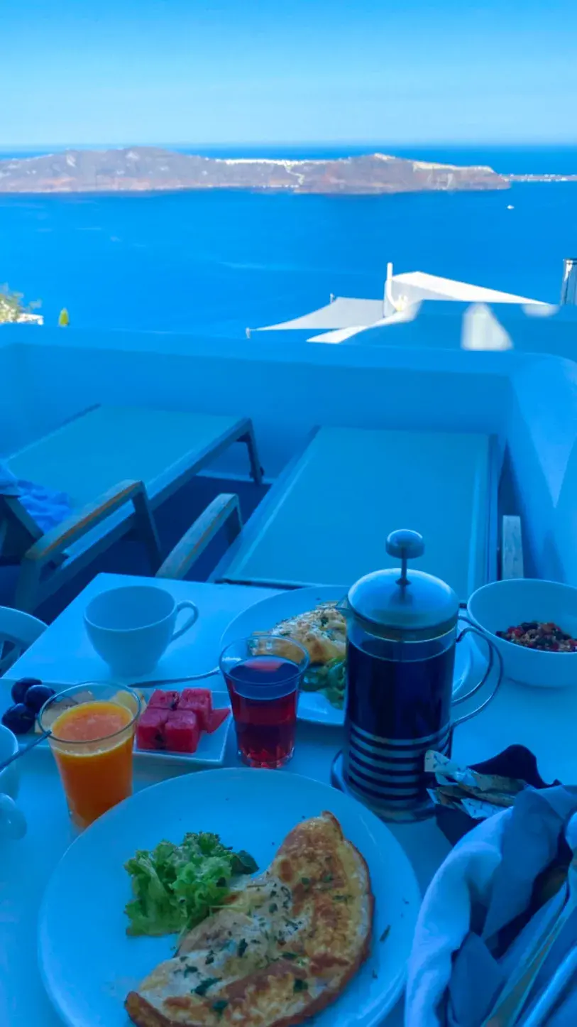 Teníamos claro que queríamos un alojamiento que nos enloqueciera al despertar, con sus vistas al azul índigo, sobre la caldera. Y lo encontramos. Los desayunos sobre este abismo, verdaderamente, ¡son de locura! El desayuno sin prisa era el primer planazo del día.