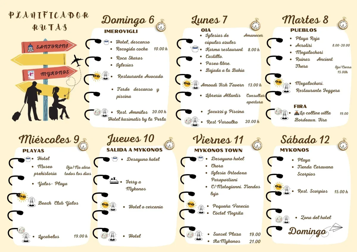 Teniendo en cuenta los aspectos anteriores, para organizar mejor los tiempos de relax, las visitas, dónde comer y cenar, etc. Hemos elaborado un planificador de rutas que nos ha resultado muy útil, para tener una visión general del viaje y tener a golpe de vista los horarios, las reservas que vamos haciendo con antelación.
