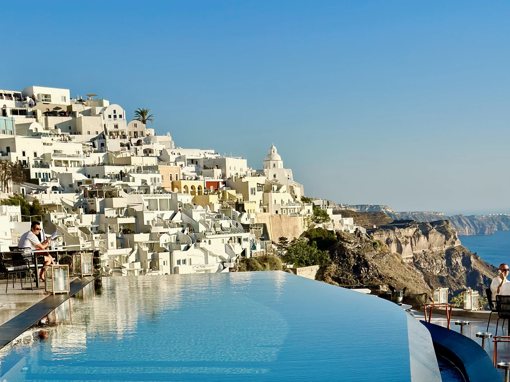 En la segunda, un escalón más abajo, una hilera de mesas y un pequeño muro te separan de una caida de más de 300 metros al mar. Lo que se traduce en una cena al borde del acantilado con unas vistas espectaculares y maravillosas a la caldera, al mar Egeo y por supuesto al atardecer. Aquí se encuentran las «Cliff Table» (la que nosotros elegimos). La reserva de la misma son sólo 20€ por persona. Eso sí, te informan que sólo dispondrás de la mesa y la cena durante 2h y media. Tiempo más que de sobra. Nosotros no tuvimos problema ya que eso se aplica siempre que haya reservas posteriores, así que estuvimos el tiempo que estimamos oportuno. Ahh, aquí el importe de la reserva sí se descuenta de la factura final.