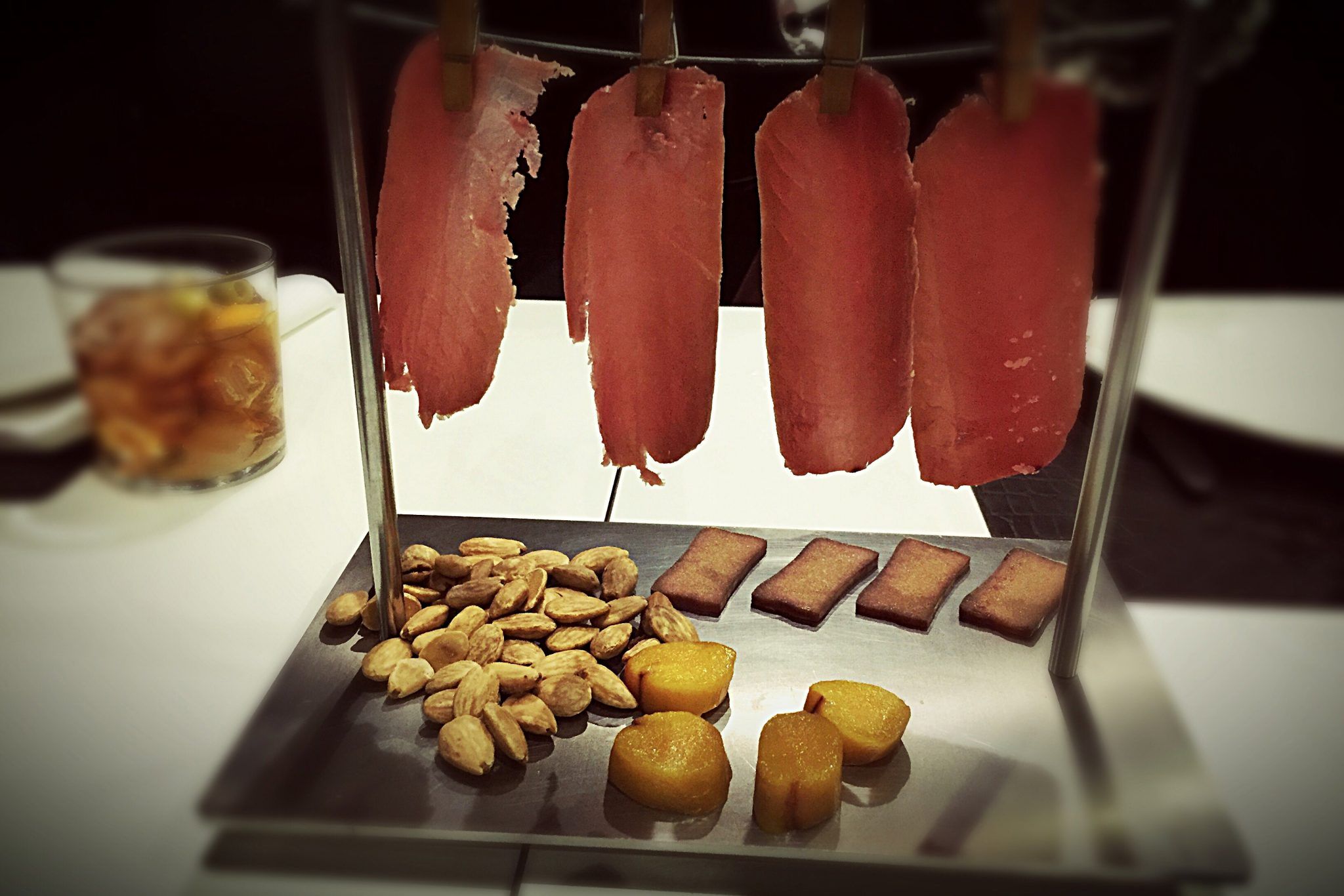 No acostumbro a nombrar ningún plato cuando realizo mi opinión, pero tengo que hacer una excepción y es que no puedo dejar escapar la oportunidad de mencionar dos de los platos que más me han impresionado, aunque he decir que todos estan de fábula, tanto en la exposición del plato como en su sabor:«Semi salazones a la intemperie con almendras fritas ahumadas», he aquí una obra maestra. Sólo el saber que tanto la elaboración del sazonado como de su secado ha sido realizado por ellos ya denota el querer realizar algo especial. La suavidad de la mojama con un toque suave a sal, hace que se deshaga en la boca sin tener que realizar movimiento alguno es algo digno de alabar. Y atrás no se queda la hueva de mujol, bocado exquisito. Aún salivo al recordarlo, sin duda un plato a repetir en mi próxima visita, que será más bien pronto que tarde.«Trigo meloso de bogavante y papel crujiente de gamba». Vaya por delante que nunca he sido muy «amigo» del Guiso de Trigo o «Trigo Pelao» como es conocido por mi zona, y estuve algo reacio a probarlo, ya que mis «aventuras» anteriores con este producto no habían sido muy placenteras, todo sea dicho. Pero Tomás, con este plato, me ha conquistado para siempre. Su cremosidad y su punto de coción en boca entremezclado con los sabores del bogavante es algo sublime. Y si todo esto viene acompañado de una presentación en un «mini» torreón de barro, el encanto está totalmente conseguido.
