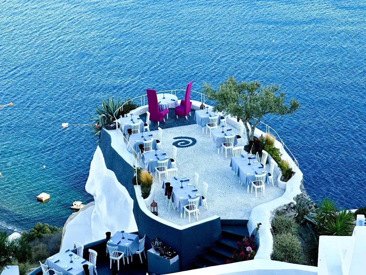 Su diseño interior presenta elementos tradicionales griegos, como paredes encaladas y detalles en azul, que evocan la esencia de las Islas Griegas. La «crème de la crème», sin duda, es la terraza al aire libre, donde los comensales pueden disfrutar de una vista panorámica impresionante mientras cenas en uno de los restaurantes votado como más bello del mundo.