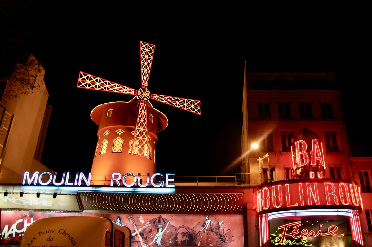 Finalizada la cena llegamos al clímax de la noche: el Moulin Rouge: El templo del can-can y las lentejuelas, el cabaret más famoso del planeta. Lo reconocerás por su molino rojo giratorio, su fachada de neón y la cola de gente con cara de “esta noche va a ser épica”.