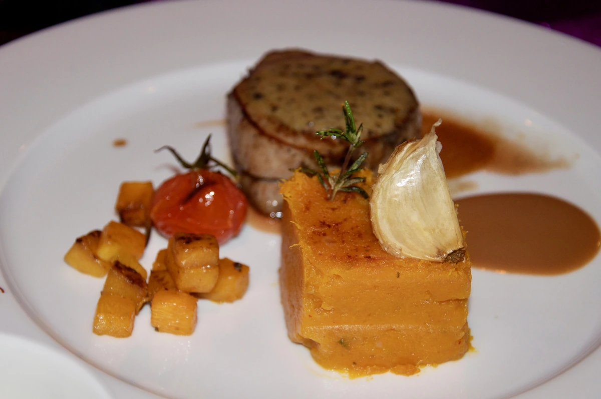 Terminados con los entrantes continuamos con los principales. Para Selema un Noisette de veau poêlée, potiron butternut au romarin. El clásico «noisette» de ternera: redondo, dorado, jugoso. Lo acompañaba una crema de calabaza butternut con romero que era puro otoño en la boca. Aromático, suave y con ese toque campestre chic.