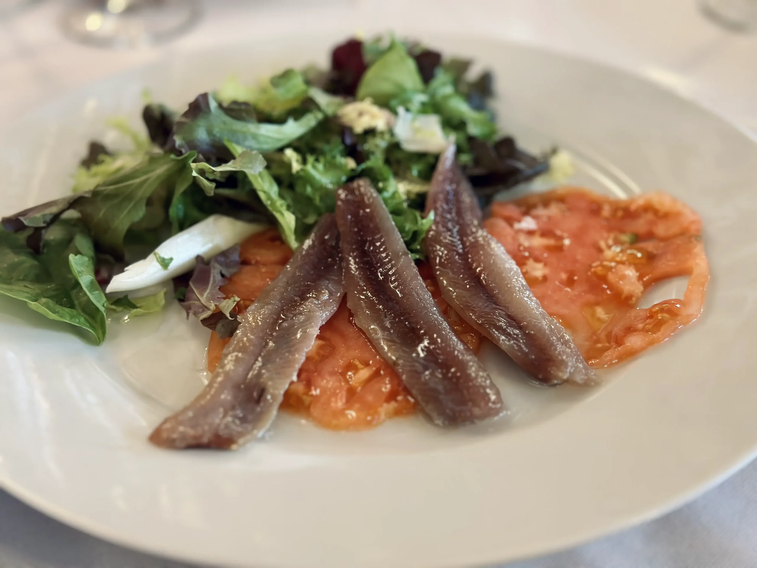 En los entrantes, a compartir a mesa cada 4 comensales, una Sardina ahumada con tomate natural y unas Croquetas de carabineros con patatas paja y mermelada de tomate. Tremendamente recomendable las croquetas. Una delicia.