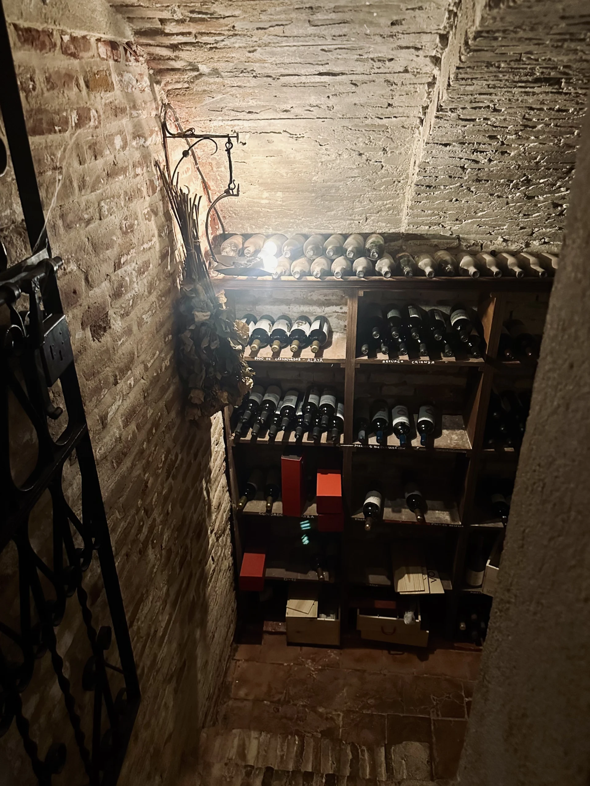 En el centro hay una mesa de madera, comida por el paso del tiempo, a la cual la acompañan seis sillas. A su alrededor estanterías con los vinos más preciados y afamados del restaurante, así como enseres varios. Puedes imaginarte aquí sentados a los miembros de la Orden de Toledo degustando sus caldos y contando sus alocadas aventuras. Impresionante las sensaciones.